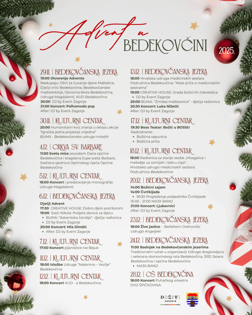 – Želimo da se svaki posjetitelj osjeća kao da je ušao u svijet božićne bajke. Ove godine ulažemo više nego ikad u vizualni doživljaj, u sadržaj i u zajedništvo. Subotom ćemo dodatno oživjeti šetnicu i vožnjom kočijom, što će biti pravo iznenađenje za naše najmlađe, ali i za sve one koji vole blagdanski štimung. Advent u Bedekovčini je advent cijele zajednice – svatko daje svoj doprinos, od vrtićke djece do udruga, obrtnika i naših najstarijih mještana. – naglasio je načelnik Odak, dodajući kako želi da ovogodišnji Advent bude događaj koji će pamtiti i mještani i posjetitelji iz susjednih krajeva.
