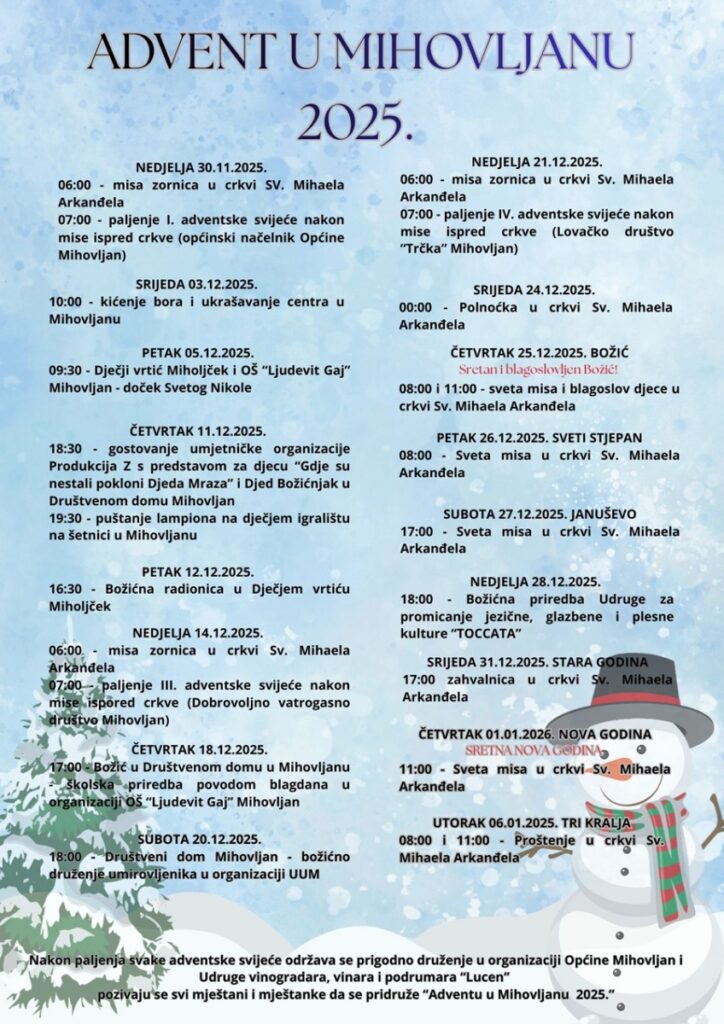 Program “Advent u Mihovljanu 2025.” donosi raznovrsna događanja za sve generacije -od misa zornica, prigodnih radionica i dječjih predstava do tradicionalnih paljenja adventskih svijeća i bogatog kulturno-zabavnog programa.