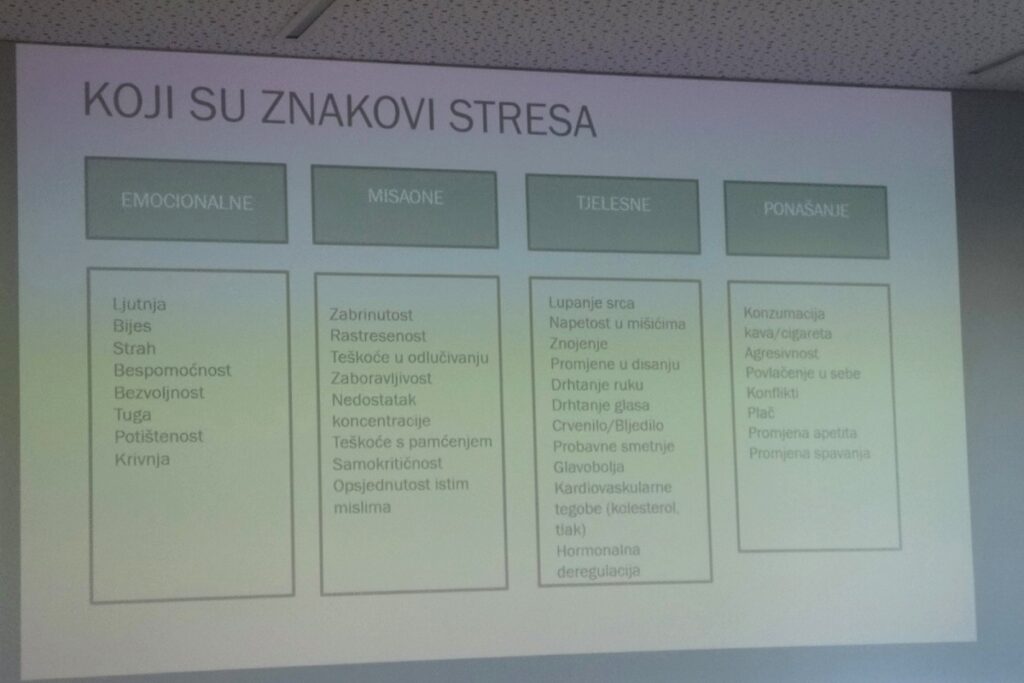 -Vrijeme u kojem živimo, ovaj moderan način života stvara mnogo vanjskih pritisaka, ali i mi sami često pred sebe stavljamo zahtjeve koji dolaze iznutra i to je ono o čemu danas razgovaramo, da to osvijestimo i da te pritiske koji nam nisu zadani izvana, sagledamo, vidimo kako ih možemo kontrolirati i utjecati na njih-rekla je Zovko Kordić dodavši kako za to postoji mnogo tehnika. Naglasila je kako prvo trebamo osvijestiti sebe, svojih reakcija i okidača.