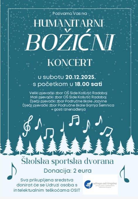 18:00 sati, u školskoj sportskoj dvorani, održat će se Humanitarni božićni koncert. Nastupit će: