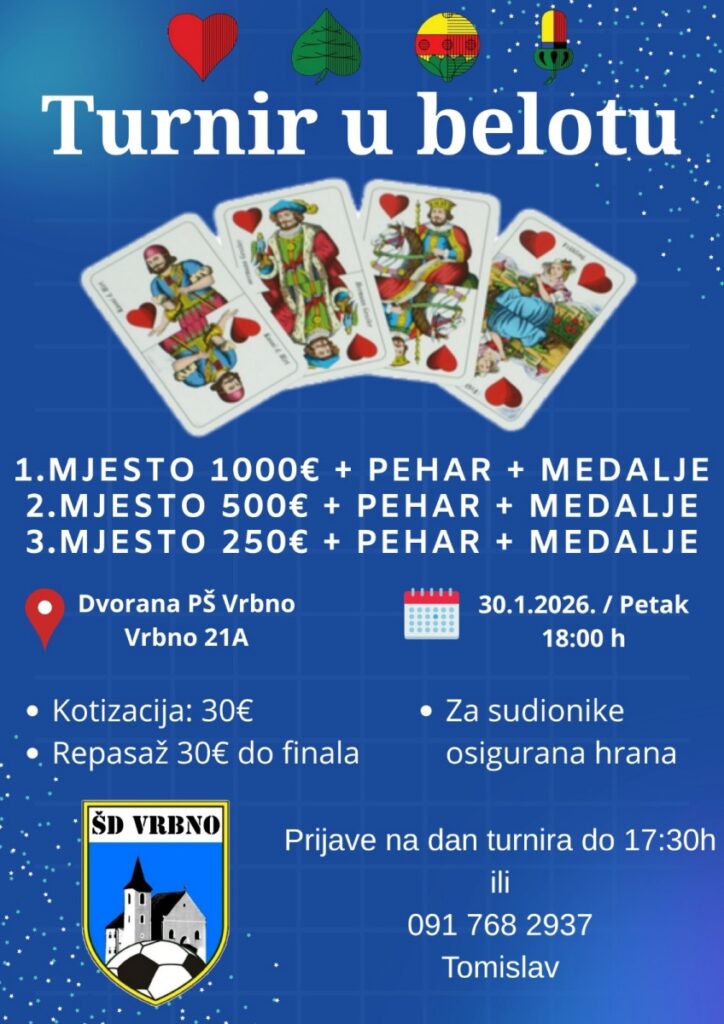Športsko društvo Vrbno s ponosom najavljuje 2. Turnir u Belotu, koji će se održati u subotu, 31. siječnja 2026. godine, u dvorani Područne škole Vrbno, s početkom u 18:00 sati.