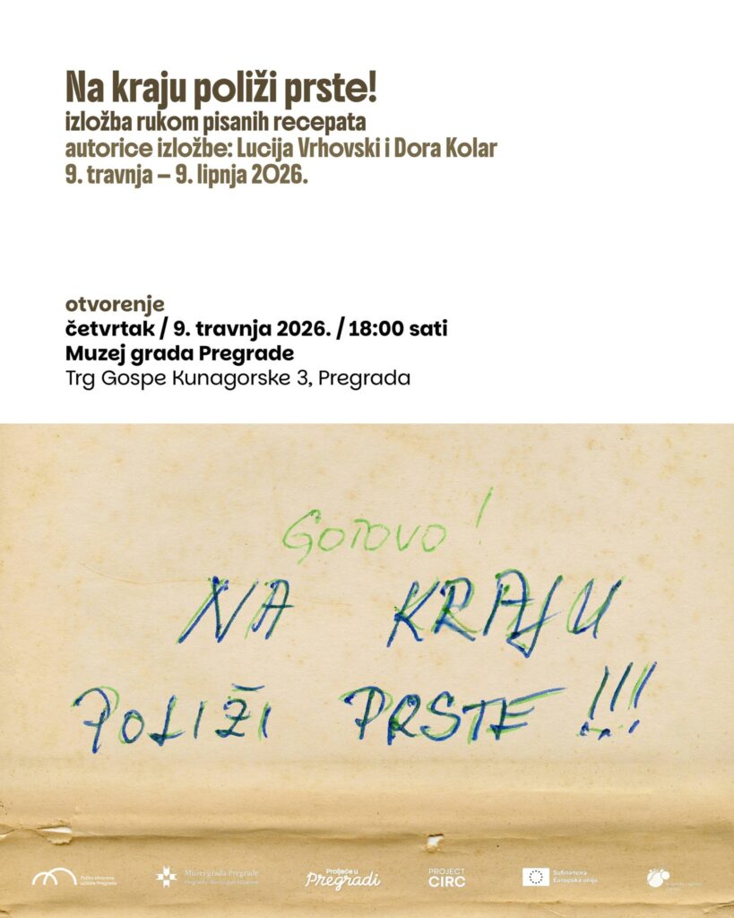 Četvrtak, 9. travnja u 18:00 – Otvorenje izložbe „Na kraju poliži prste!“ autorica Lucije Vrhovski i Dore Kolar. Izložba je posvećena rukom pisanima receptima koji generacijama povezuju žene, a otvorenje će se održati u galeriji Muzeja.