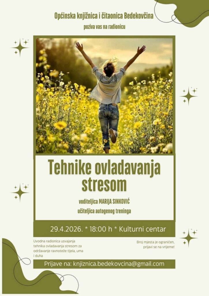 Upravo s tim ciljem organizira se radionica pod nazivom „Tehnike ovladavanja stresom“, koju će voditi Marija Sinković, učiteljica autogenog treninga. Radionica će se održati 29. travnja 2026. godine u Kulturnom centru u Bedekovčini s početkom u 18 sati.
