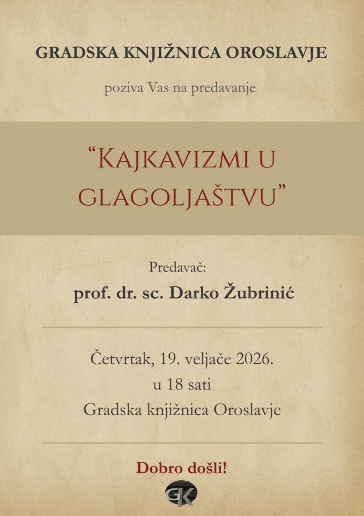 Povodom obilježavanja Dana hrvatske glagoljice i glagoljaštva Gradska knjižnica Oroslavje poziva vas na predavanje “Kajkavizmi u glagoljaštvu” prof. dr. sc. Darka Žubrinića.