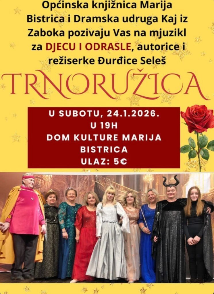 Općinska knjižnica Marija Bistrica u suradnji s Dramskom udrugom Kaj iz Zaboka poziva sve ljubitelje kazališta na mjuzikl “Trnoružica”, namijenjen i djeci i odraslima.