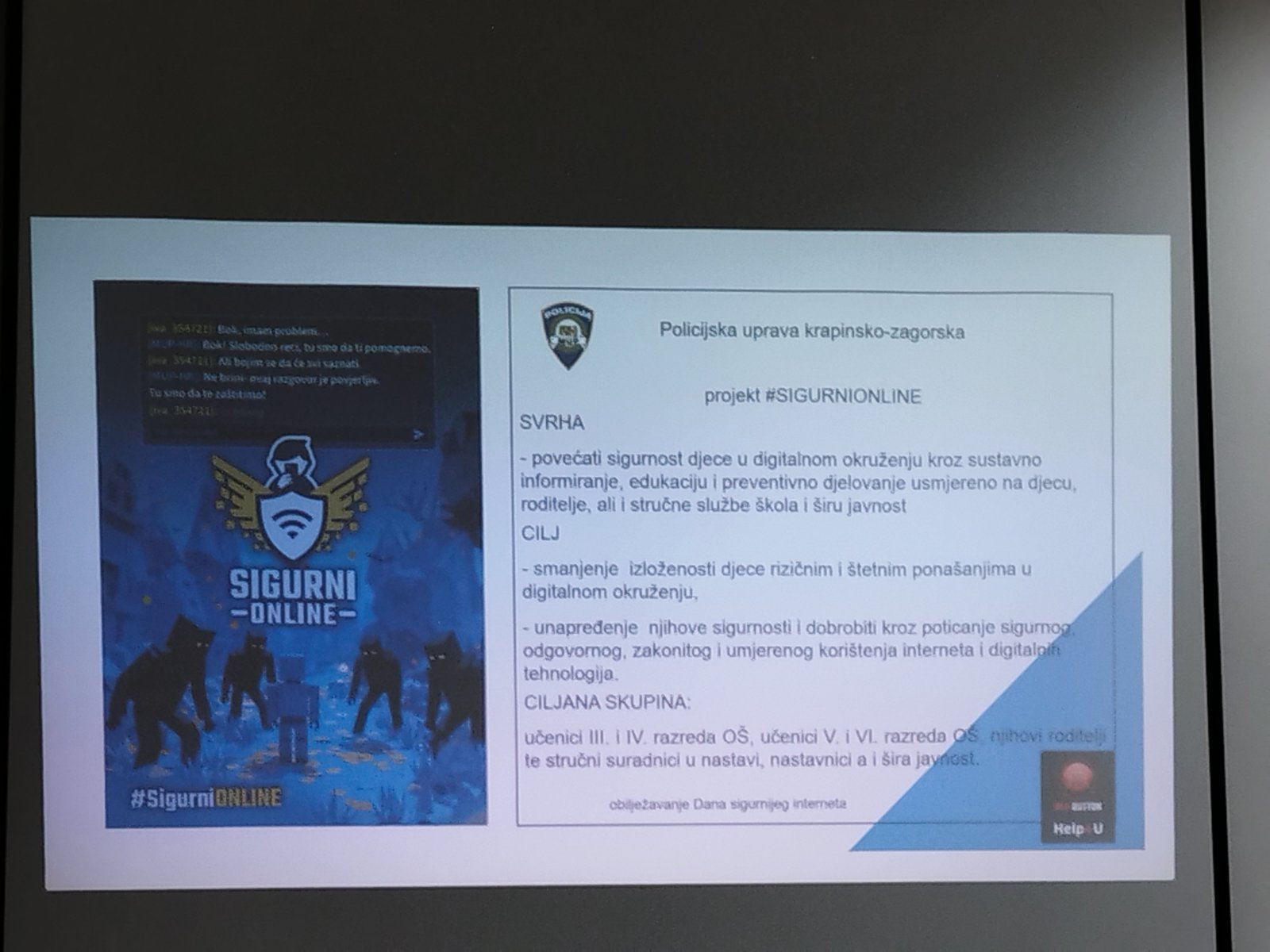 Projekt „Sigurni online“ uključuje edukativna predavanja i radionice, a Policijska uprava krapinsko-zagorska aktivno se uključila u provedbu svih njegovih komponenti. Ciljana skupina su učenici 3. i 4. razreda, te 5. i 6. razreda osnovnih škola, kao i njihovi roditelji.