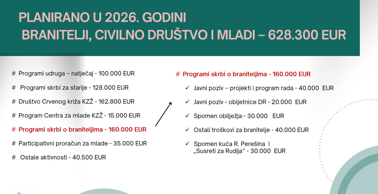 Za programe namijenjene hrvatskim braniteljima prošle je godine izdvojeno 171 tisuću eura. Sredstva su usmjerena na jačanje dostojanstva branitelja, očuvanje istine o Domovinskom ratu, psihosocijalnu podršku, obilježavanje obljetnica te izgradnju spomen-obilježja. Posebno je istaknuta i kontinuirana skrb kroz upravne postupke, ostvarivanje prava te organizaciju pokopa hrvatskih branitelja uz vojne počasti.