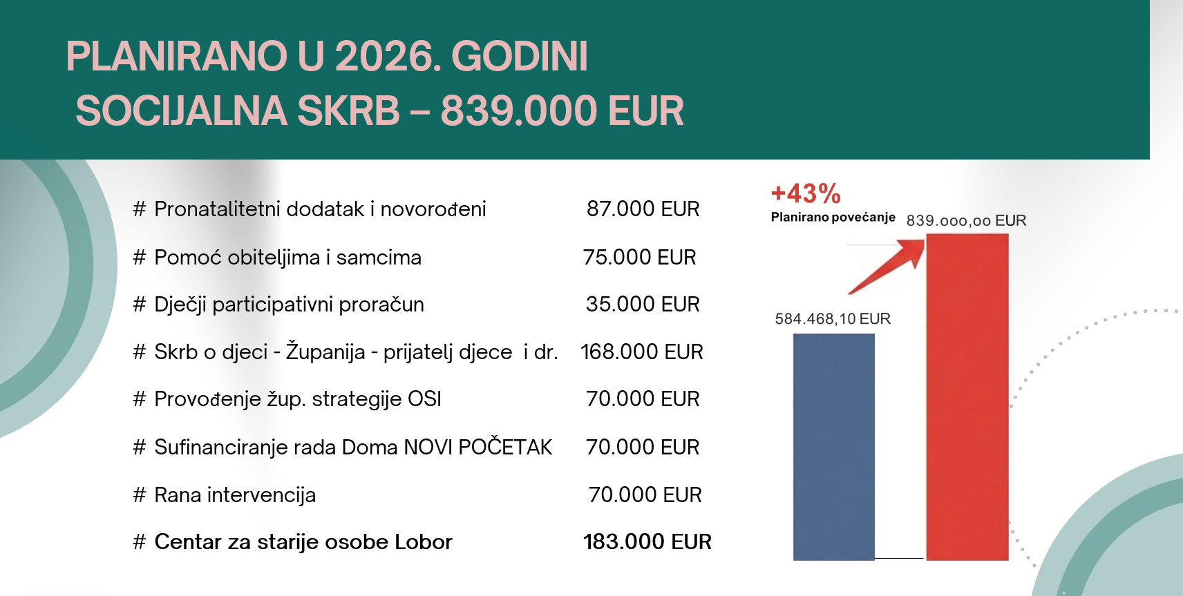 Tu je i dječji participativni proračun, sufinanciranje dječje PIK PAK kuće u Zaboku te jedna nova usluga, a to je podrška ili sufinanciranje boravka roditelja kao pratnje djeteta u Općoj bolnici Zabok i bolnici Hrvatskih veterana.