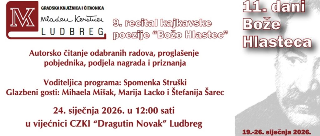 U subotu, 24. siječnja 2026. u 12 sati, u vijećnici Centra za kulturu i informiranje „Dragutin Novak“ u Ludbregu održat će se 9. recital kajkavske poezije „Božo Hlastec“.