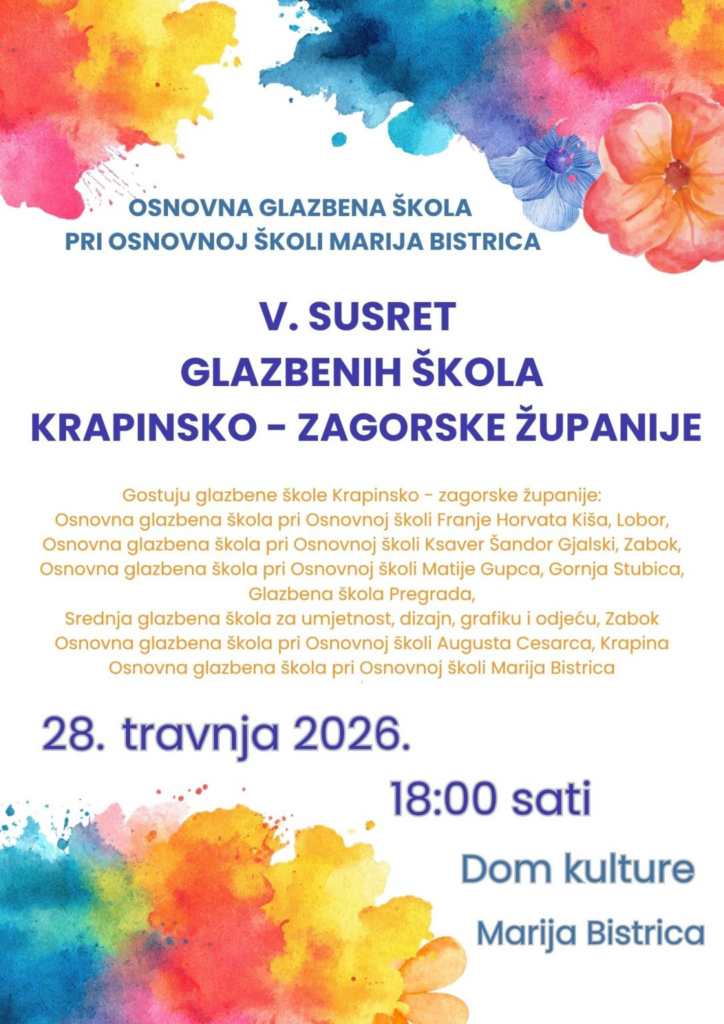 Susret također omogućuje učenicima dodatne prilike za javne nastupe i koncertna iskustva unutar županije. Ovaj glazbeni događaj održat će se u utorak 28. travnja 2026. godine u Domu kulture Marija Bistrica, s početkom u 18:00 sati.