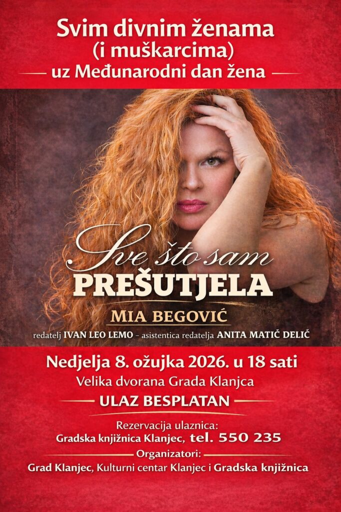 U nedjelju, 8. ožujka 2026. godine s početkom u 18 sati, u Velikoj dvorani Grada Klanjca gostuje proslavljena hrvatska glumica Mia Begović s hit predstavom „Sve što sam prešutjela“.