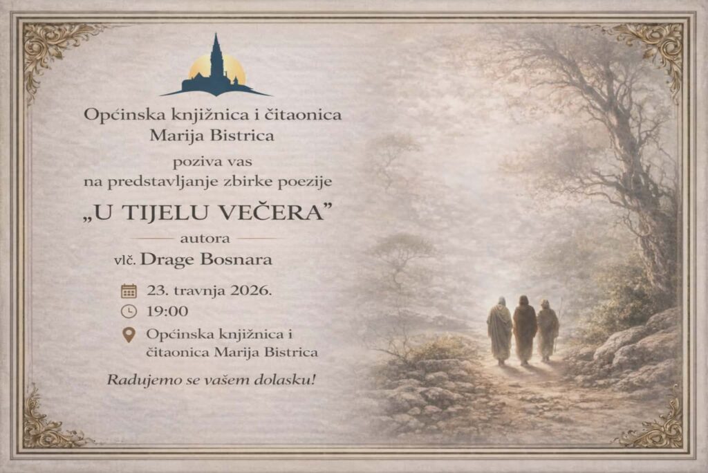 U sklopu obilježavanja Noći knjige, Općinska knjižnica i čitaonica Marija Bistrica priprema poseban kulturni događaj, predstavljanje zbirke poezije „U tijelu večera“ autora vlč. Drage Bosnara.