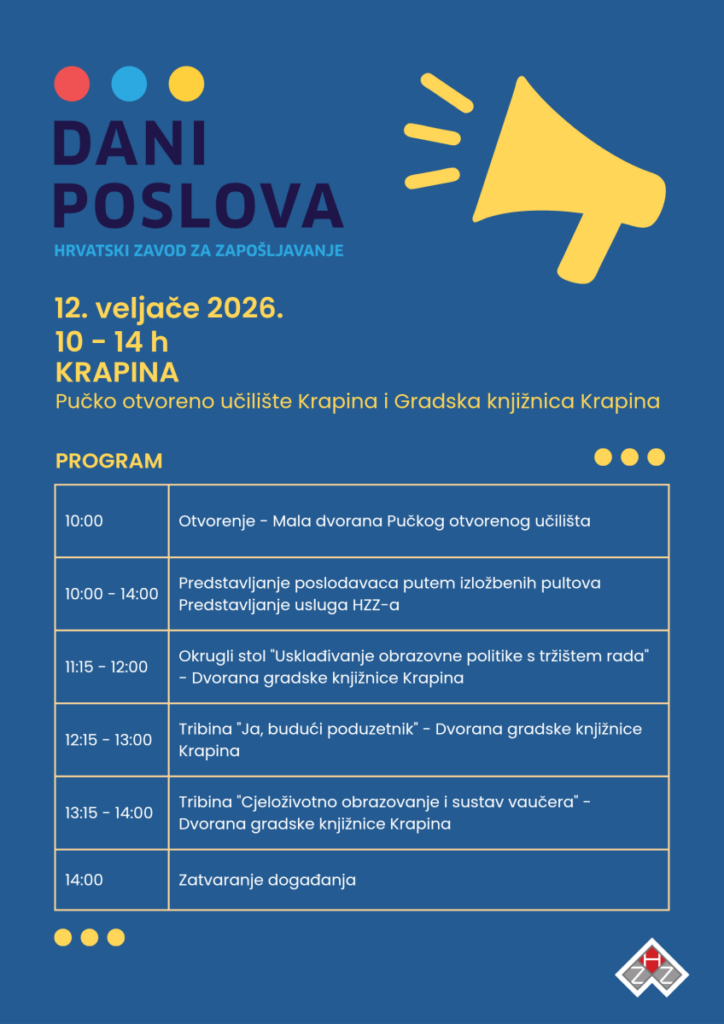 Hrvatski zavod za zapošljavanje, Područni ured Krapina organizira “Dane poslova 2026. u Krapinsko-zagorskoj županiji” koji će se održati u četvrtak, 12. veljače 2026. godine, od 10:00 do 14:00 sati, u prostoru Pučkog otvorenog učilišta Krapina i u dvorani Gradske knjižnice Krapina.