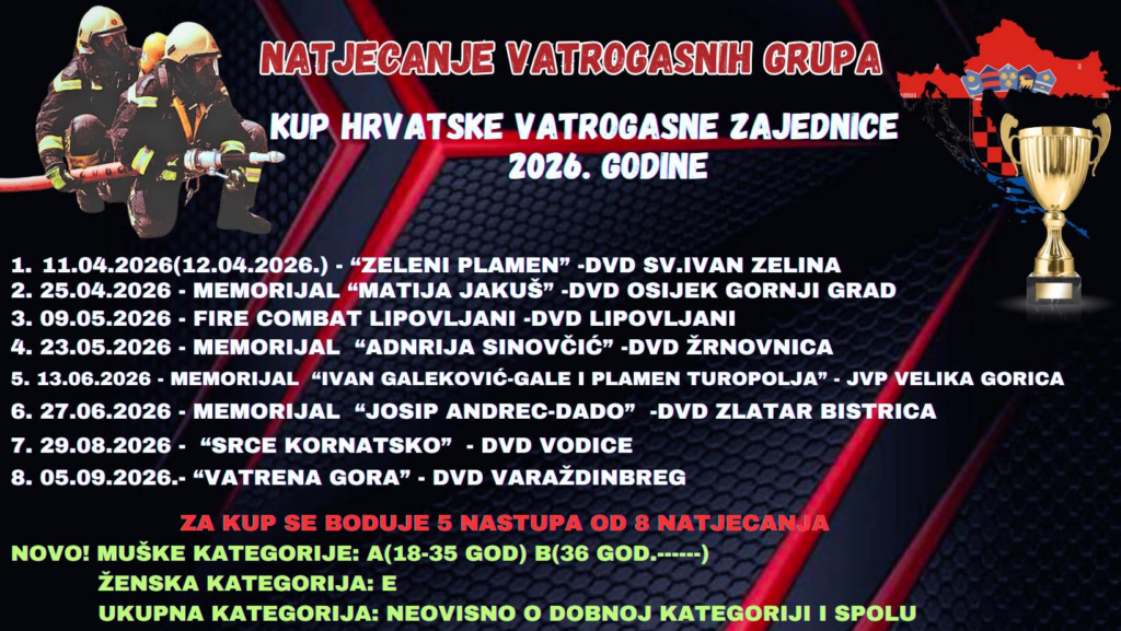 Nova sezona Fire Combat natjecanja donosi niz uzbudljivih nadmetanja vatrogasnih grupa diljem Hrvatske u sklopu Kupa Hrvatske vatrogasne zajednice za 2026. godinu.
