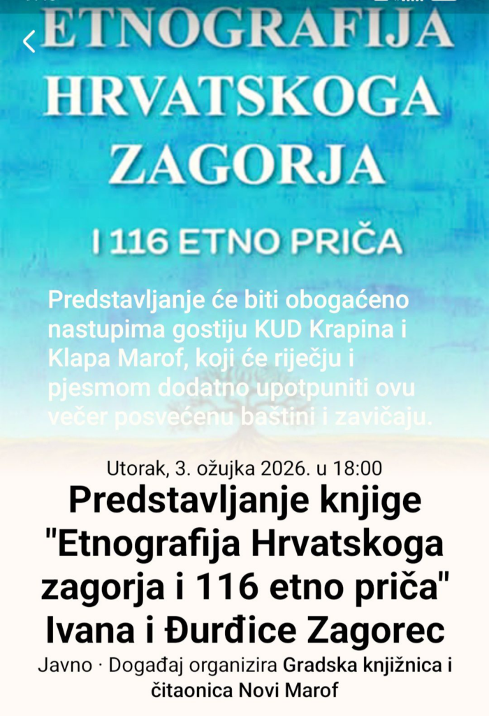 U utorak, 3. ožujka 2026. godine u 18:00 sati, u Gradskoj knjižnici i čitaonici Novi Marof, održat će se predstavljanje knjige “Etnografija Hrvatskoga zagorja i 116 etno priča” autora Ivana i Đurđice Zagorec.