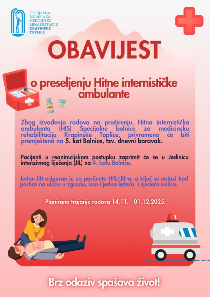 Zbog izvođenja radova na proširenju prostora, Hitna internistička ambulanta (HIS) Specijalne bolnice za medicinsku rehabilitaciju Krapinske Toplice privremeno će biti premještena na peti kat Bolnice, u prostor tzv. dnevnog boravka.