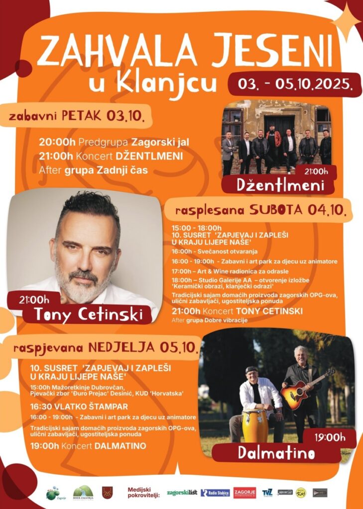 Grad Klanjec i Kulturni centar Klanjec danas, 30. rujna su najavili tradicionalnu trodnevnu kulturno-turističku manifestaciju „Zahvala jeseni u Klanjcu 2025.“, koja će se održati od 3. do 5. listopada na središnjem gradskom trgu.