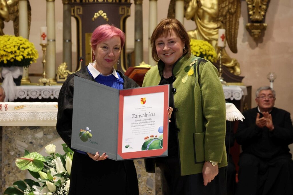 Zamjenica župana KZŽ, Jasna Petek, organizatorima je uručila Zahvalnicu za 30 godina organizacije županijskog Susreta pjevačkih zborova i malih vokalnih sastava te izniman doprinos kulturnom identitetu KZŽ.