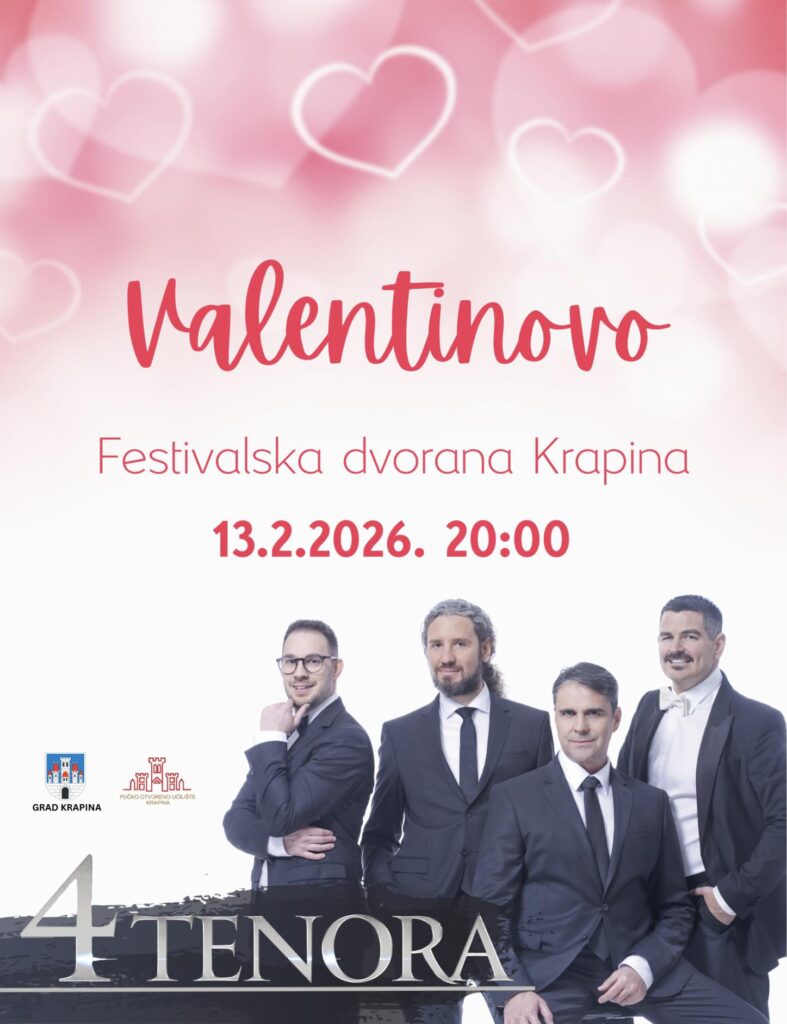 Povodom Valentinova, u petak 13. veljače 2026. godine s početkom u 20 sati, Festivalska dvorana Krapina postaje mjesto susreta ljubavi, emocija i vrhunske glazbene umjetnosti. U Krapinu dolaze Četiri tenora-istinska glazbena elita i jedan od najpopularnijih vokalnih sastava u Hrvatskoj.