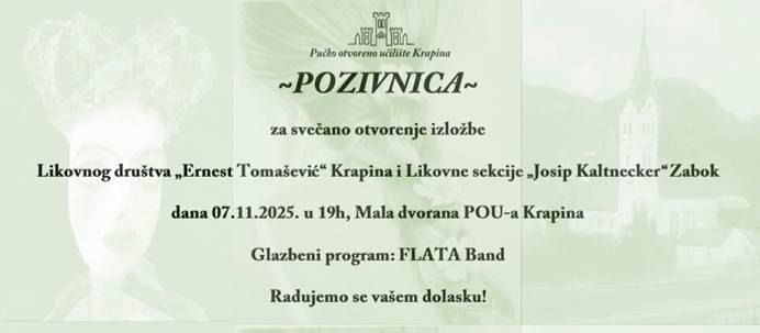 Večeras, 7. studenoga 2025. u 19 sati, u Maloj dvorani Pučkog otvorenog učilišta Krapina održat će se svečano otvorenje izložbe članova Likovnog društva „Ernest Tomašević“ Krapina i Likovne sekcije „Josip Kaltnecker“ Zabok.