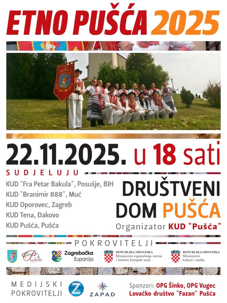 Pušća će i ove godine biti domaćin jednom od najšarenijih i najradosnijih folklornih događaja u okolici – manifestaciji Etno Pušća 2025, koja će se održati 22. studenoga 2025. u 18 sati u Društvenom domu Pušća.