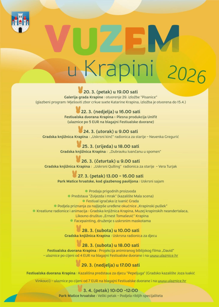 Grad Krapina i ove godine priprema bogat i raznolik program povodom uskrsnih blagdana kroz manifestaciju Vuzem u Krapini 2026, koja će tijekom ožujka i početkom travnja donijeti niz kulturnih, zabavnih i edukativnih događanja za sve generacije.
